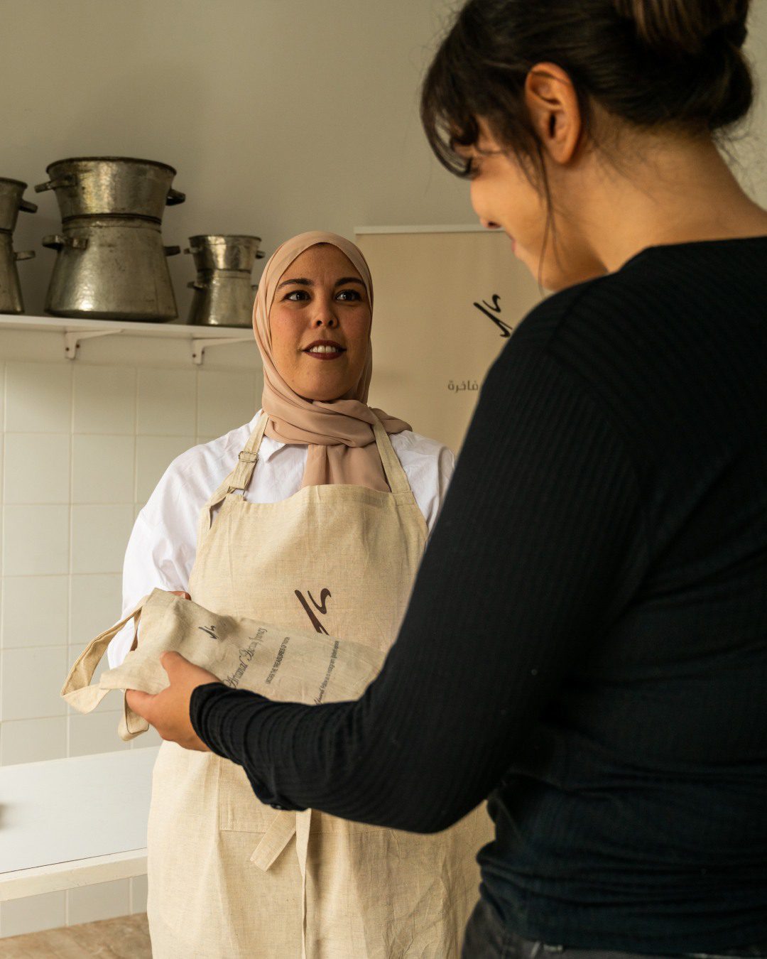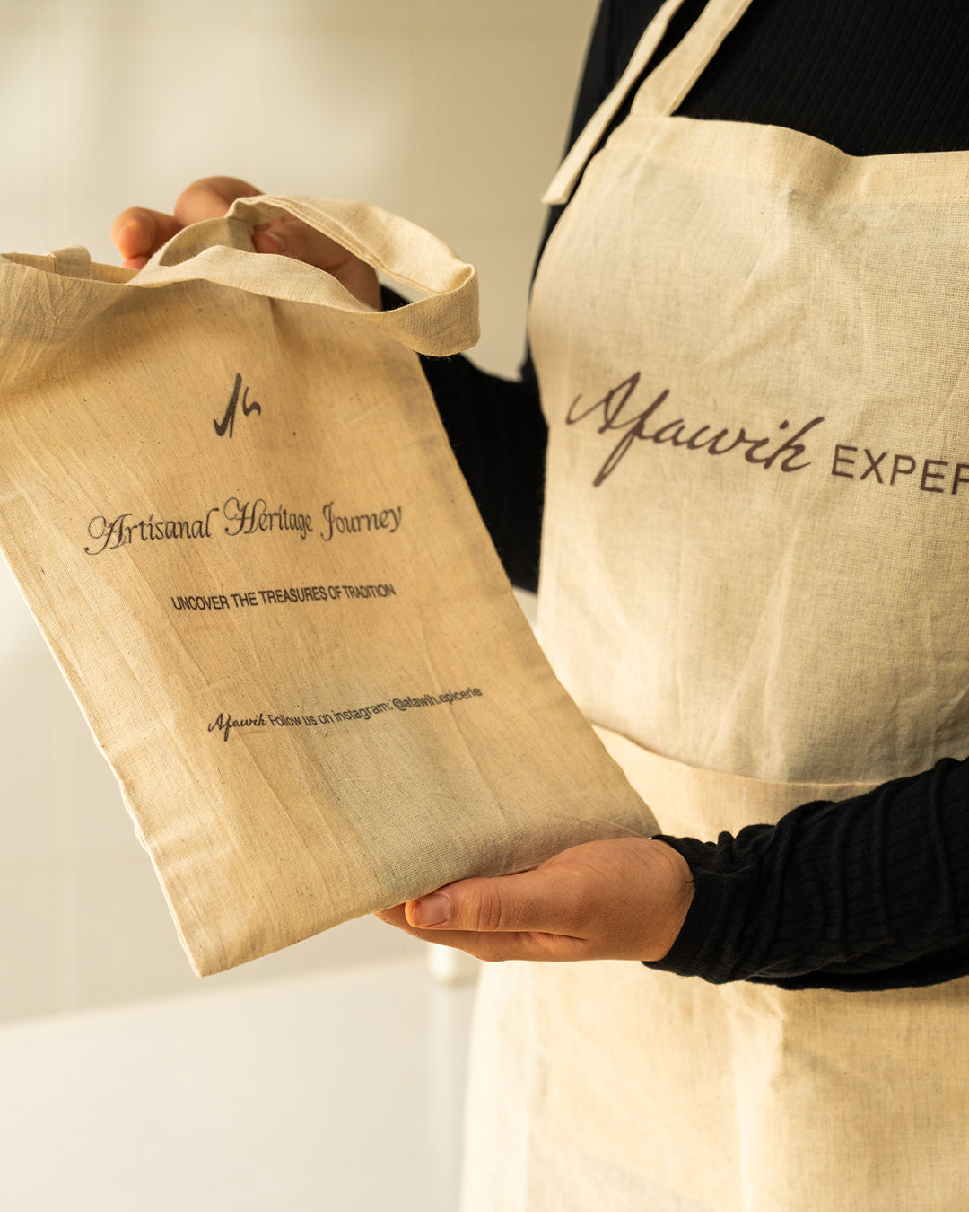 Gants | Tablier Afawih organique | Tote bag Afawih | Serfita (Serviette Cotton) | Louche en bois | Ciseaux | Mehrez antique doré (mortier et pilon) | Moulin Arbi (moulin à manivelle) | Makfoul Nhass (grande passoire traditionnelle en cuivre martelé pour égoutter et filtrer) | Tanjra Nhass (grande marmite traditionnelle en cuivre martelé utilisée pour la cuisson et le trempage) | Plats en céramique | Mida Arbi rectangulaire longue | Tabouré en bois Zemnia | Sous-tasse en palmier.